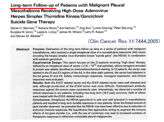 最近の試みとして、少し遺伝子治療とは趣が違いますが、腫瘍溶解性単純ヘルペスウイルスがあります。ヘルペスウイルスに遺伝的操作を加えて、脳腫瘍や大腸がんや乳がんに入れた時のみウイルスが増えてがんが溶けることを目指している研究者がいます。中皮腫へ応用してみてはどうかということです。