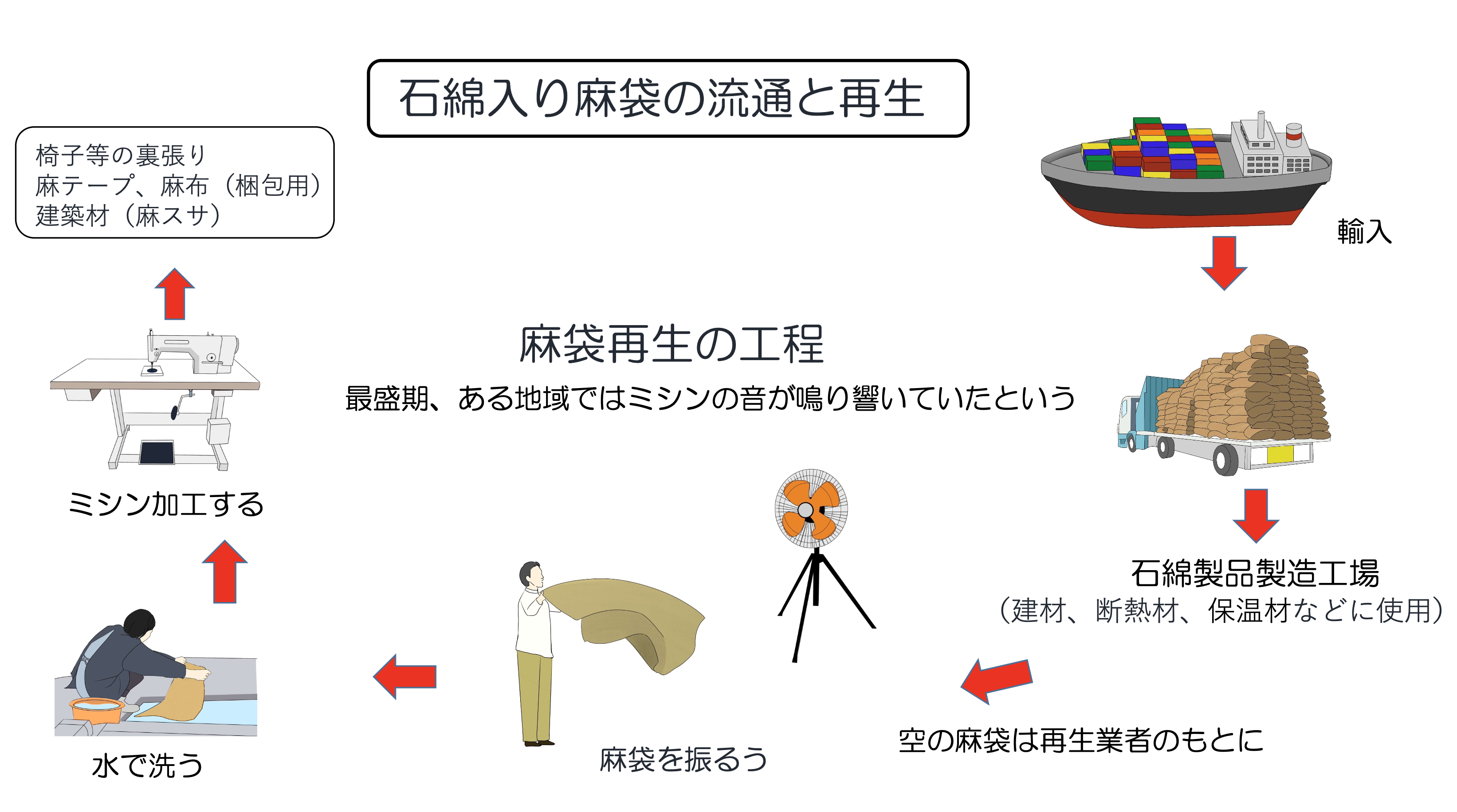 古来より麻袋は梱包材として重宝され、石綿が輸入される時も使用されました。